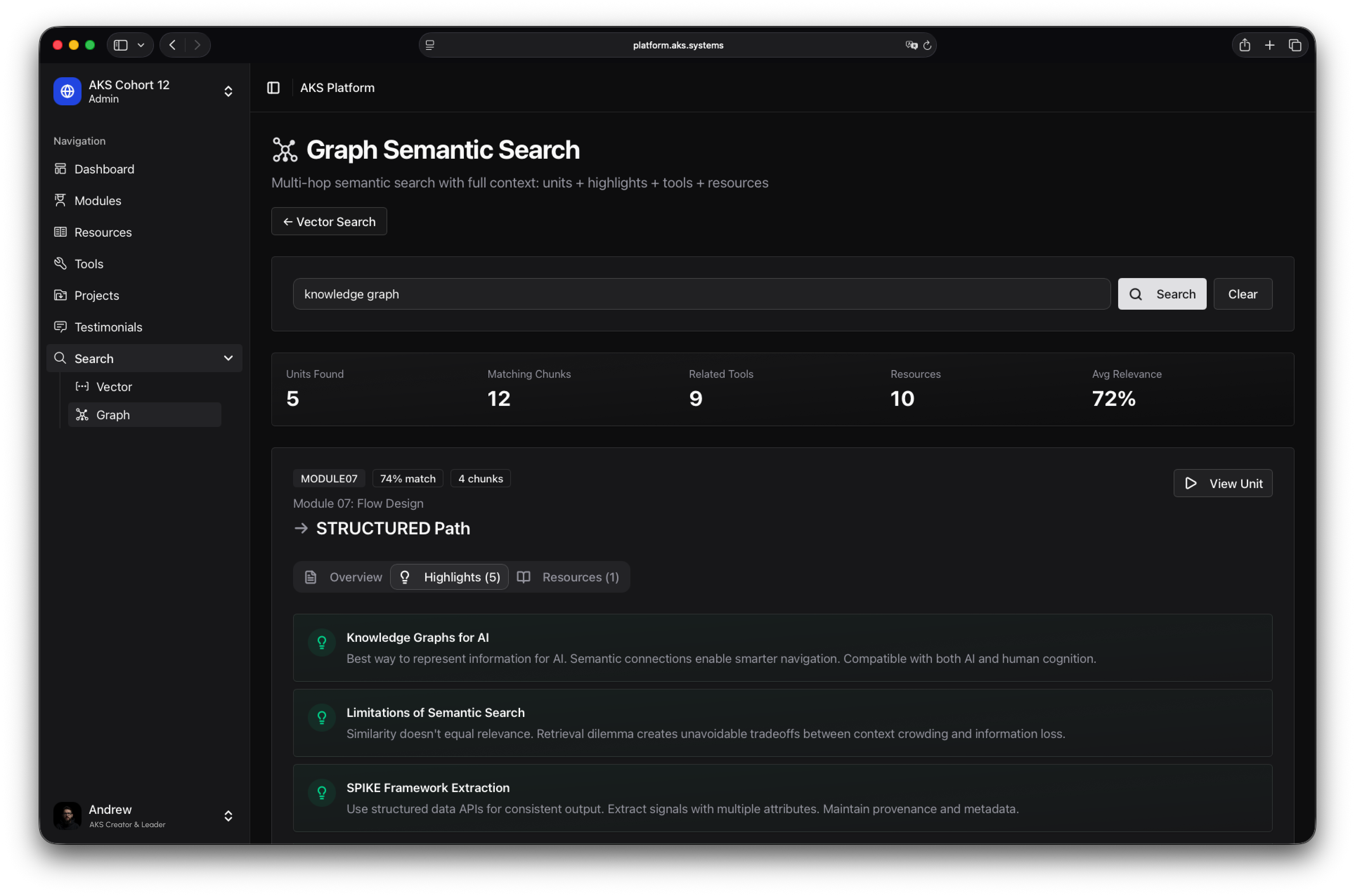 Multi-hop means: when semantic search finds a specific chunk → it can hop to the unit from which this fragment came from [hop 1] → and from the unit to connected resources/highlights/tools [hop 2]Cohort participants can connect the MCP to any agent and get a companion to the course.